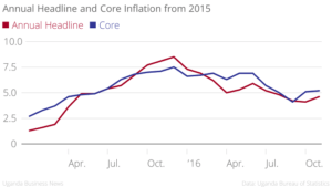 Inflation for the year ended November 2016 rose to 4.6% from 4.1% the previous month, the first increase since July, while core inflation - a key measure targeted by the Bank of Uganda - rose for the second consecutive month to 5.2%.